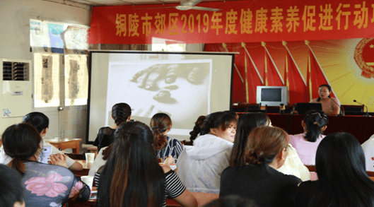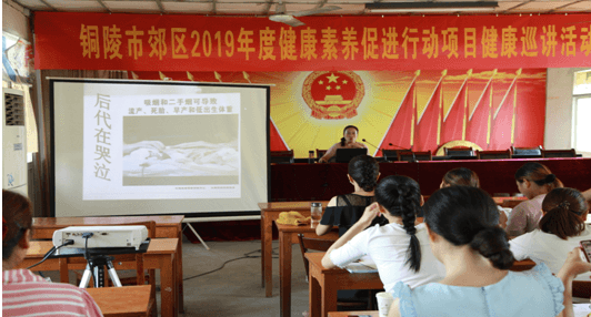 8月27日上午我院安徽省健康巡讲专家王娉婷同志乘车来到铜陵市郊区周潭镇政府开展题为“烟草危害与健康”的知识讲座。本次培训共有百余名社区居民参加,讲座从烟草中所含危害物质、吸烟导致的疾病、如何帮助吸烟者戒烟等方面进行讲解,培训现场气氛活跃,大家积极讨论,在座居民纷纷表示这样的讲座安排合理,内容丰富实用、课件新颖,让他们在家门口就能了解很多的健康科普知识。此次培训目的是向大家普及健康素养基本知识,倡导健康文明的生活方式,提高乡镇居民的健康素养水平。